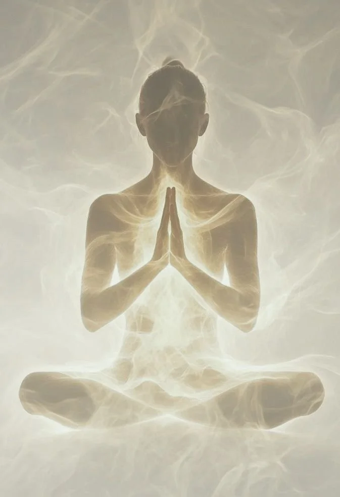 Silhouette of a person sitting cross-legged in a meditative pose with hands together, surrounded by a glowing, ethereal light and smoky aura.